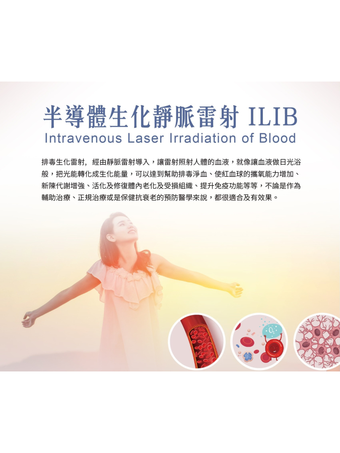 靜脈雷射ILIB(Intravenous Laser Irradiation of Blood) 是一種先進的醫療技術,通過將特定波長的低能量雷射光直接照射到靜脈血液中,進而改善血液循環、抗發炎、抗氧化、增強免疫力並促進身體的自然治癒能力。這種療法已廣泛應用於多種慢性疾病的治療以及亞健康狀況。